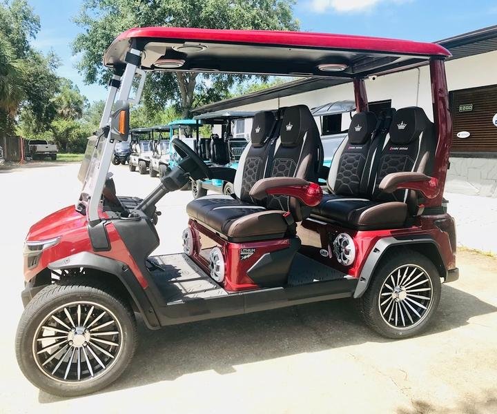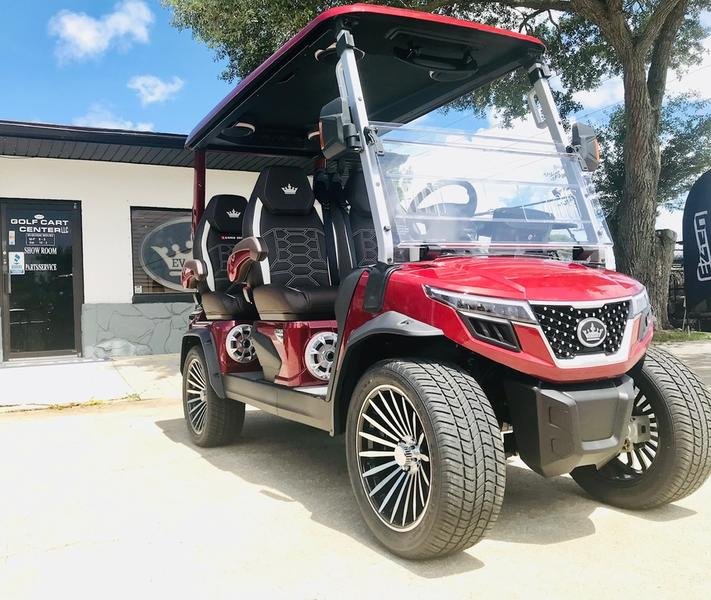 Prepare to be amazed by the 2025 Evolution D-Max GT4. This is not just a golf cart; it is a meticulously engineered luxury electric vehicle designed to deliver an experience without equal. Finished in a head-turning Flamenco Red and riding on massive 16-inch aluminum wheels, the D-Max GT4 combines show-stopping aesthetics with an astonishing suite of technology that places it in a class of its own.